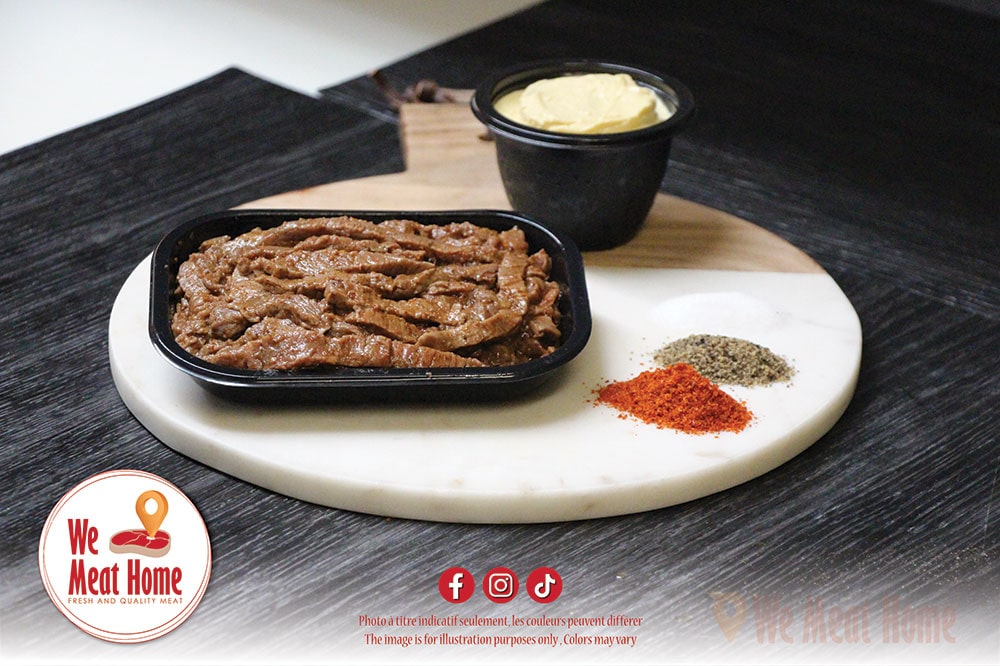 Thin beef strip (AAA and higher, Butcher’s Choice), freshly prepared with a delicious Shawarma sauce, salt, black peppers, red peppers, and crushed onion! Prepare with love to be served in your dishes!
